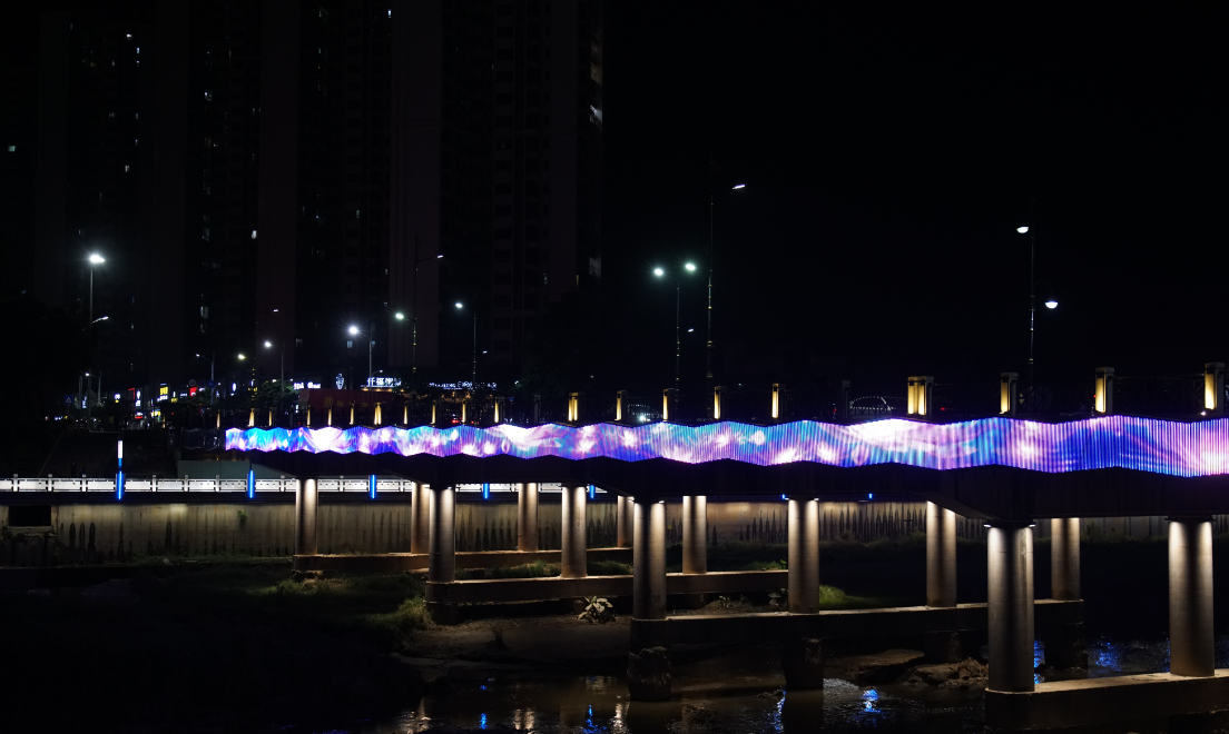 大屏與橋面路燈、兩岸河堤相互照映,以變化的色溫營造出時而統一、時而分離的整體景象,宜動宜靜,恰似一副絕美的風景畫。